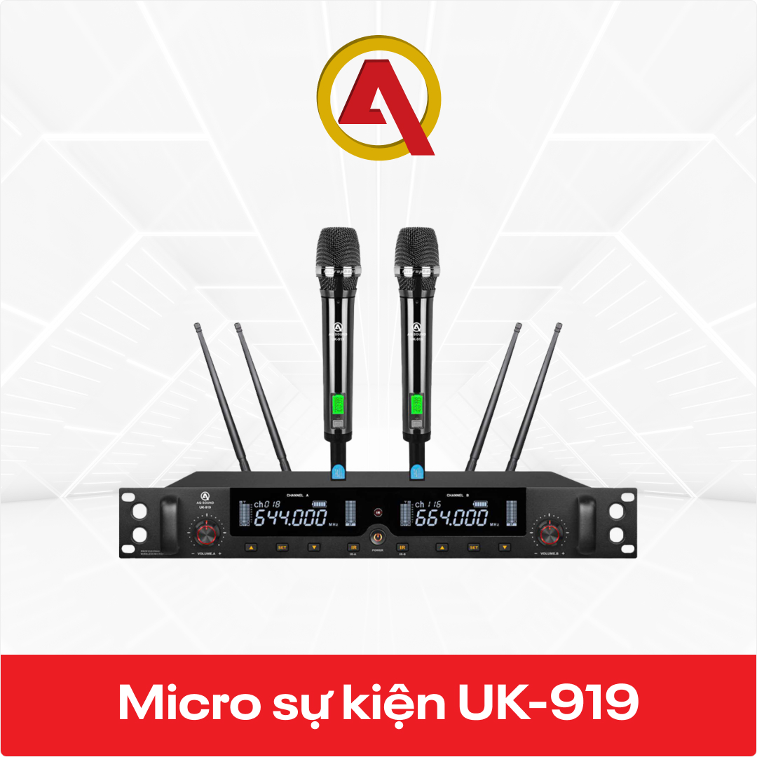 - Micro Không Dây Micro sự kiện UK-919 Với 2 kênh (kênh A và kênh B), tổng cộng 200 tần số (100 tần số/kênh) và kết nối với 4 máy thu sóng.